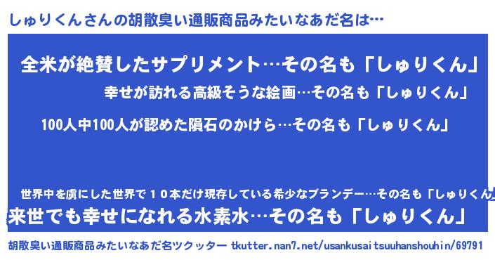 | ヒーロー風カッコイイあだ名 | 『正義の使者しゅりくん』『天弓騎士シュ』 |
