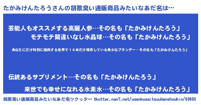 | 意味不明あだ名 | 『住所不定無職たかみけんたろう(77歳)』 |