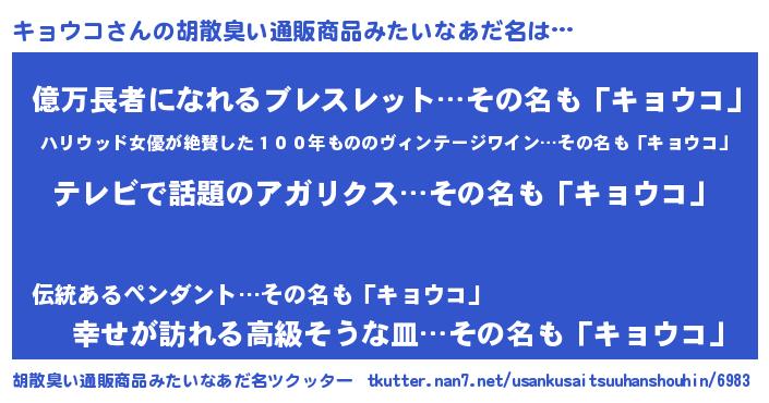 | 男性向けラノベタイトル風あだ名 | 『Re:キョウコから始める異世界生活』 |