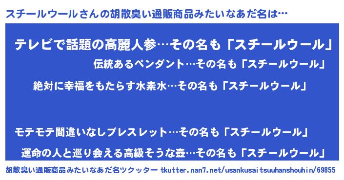 | ヒーロー風カッコイイあだ名 | 『ネオスチールウール』『幻影騎士スチ』 |