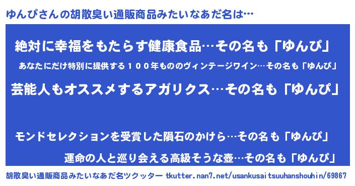 | 意味不明あだ名 | 『ヨモギ科ゆんぴ属』『自称ゆんぴ』 |