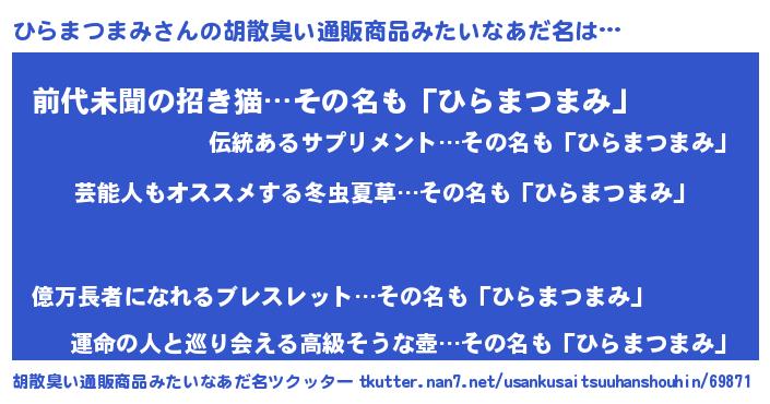 | ヘコむあだ名 | 『ひらまつまみ(遠い目)』『酢こんぶ』 |