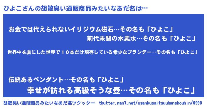 | 意味不明あだ名 | 『住所不定無職ひよこ(89歳)』 |