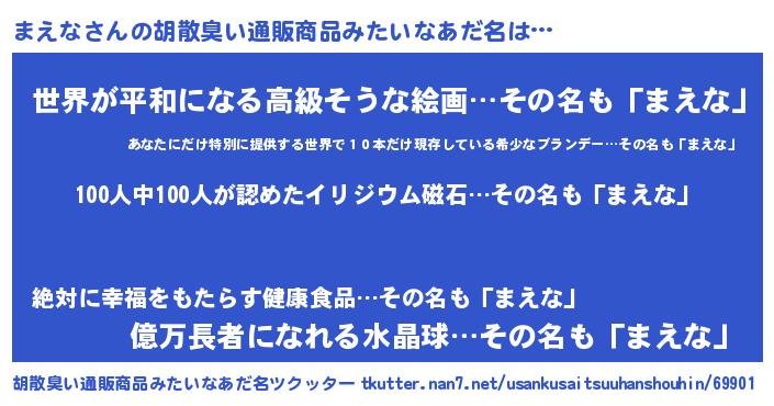 | 肩書あだ名 | 『まえな助手』『まえな総理大臣』 |