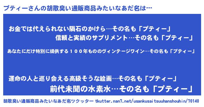| 男性向けラノベタイトル風あだ名 | 『プティーに滅ぼされるだけの簡単なお仕事です』 |