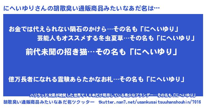 | ヘコむあだ名 | 『にへいゆり(小並感)』『にへにゅー』 |