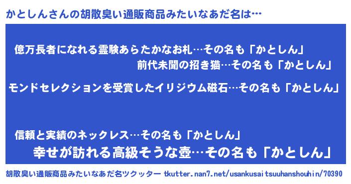 | ヒーロー風カッコイイあだ名 | 『天空の使者かとしん』『ネオカトシン』 |