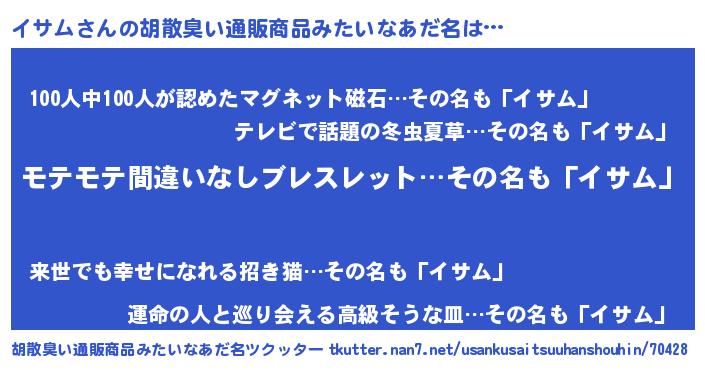 | 意味不明あだ名 | 『ペロリンイサム』『イサムフォーエバー』 |