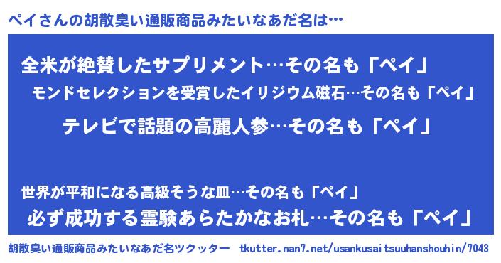 | 意味不明あだ名 | 『自称ペイ』『とにかく怪しいペイ』 |