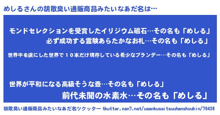 | 意味不明あだ名 | 『住所不定無職めしる(74歳)』 |