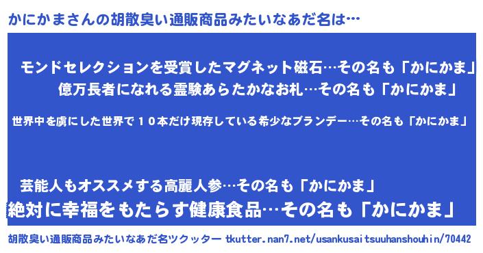 | 意味不明あだ名 | 『住所不定無職かにかま(86歳)』 |