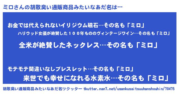 | 意味不明あだ名 | 『とにかく怪しいミロ』『永久保存ミロ』 |