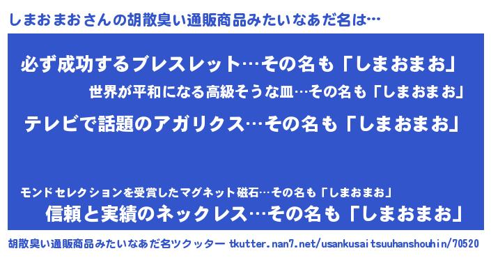 | 意味不明あだ名 | 『自称しまおまお』『ペロリンしまおまお』 |