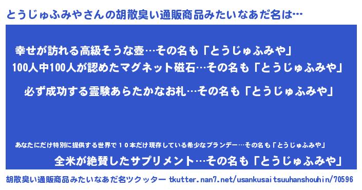 | 男性向けラノベタイトル風あだ名 | 『とうじゅふみやの憂鬱』 |