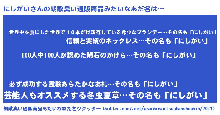 | ピコ太郎風あだ名 | 『ニニ太郎』『ニシ八郎』『ニコ二郎』 |