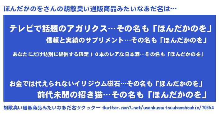 | 意味不明あだ名 | 『住所不定無職ほんだかのを(41歳)』 |