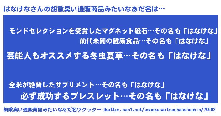 | 男性向けラノベタイトル風あだ名 | 『Re:はなけなから始める異世界生活』 |