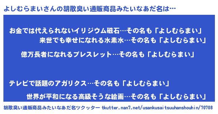 | 伝説のあだ名 | 『封印されし竜騎士よしむらまい』 |