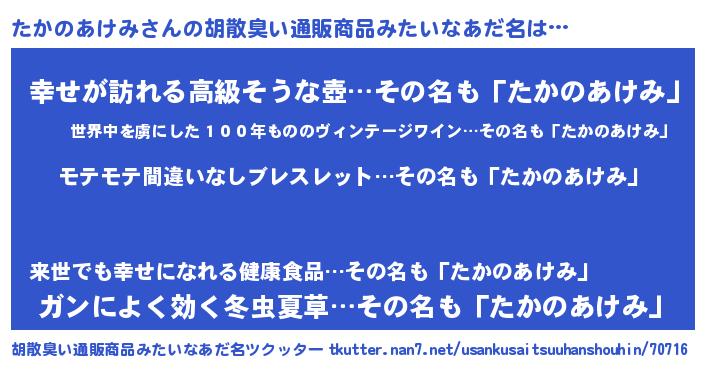 | 男性向けラノベタイトル風あだ名 | 『転生したらたかのあけみだった件』 |