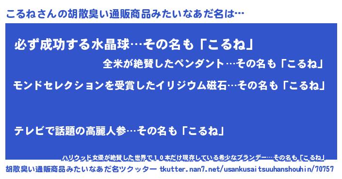 | 女子向けラノベタイトル風あだ名 | 『こるねの玉の輿計画!』『こるね恋絵巻』 |