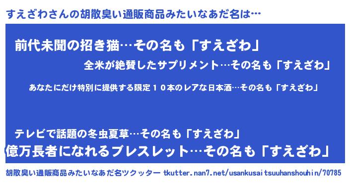 | 男性向けラノベタイトル風あだ名 | 『すえざわに滅ぼされるだけの簡単なお仕事です』 |