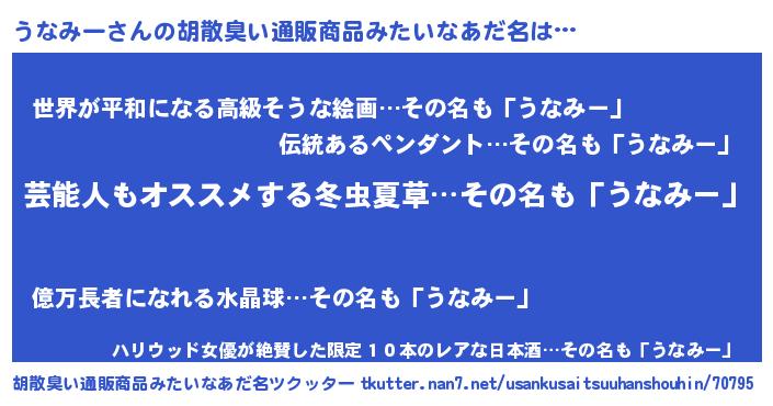 | 男性向けラノベタイトル風あだ名 | 『Re:うなみーから始める異世界生活』 |
