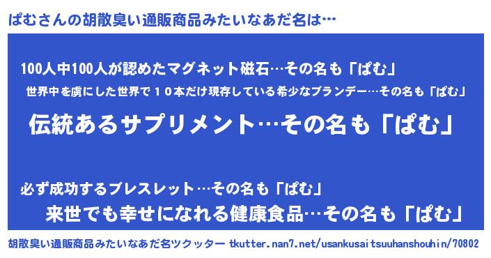 | 意味不明あだ名 | 『とにかく怪しいぱむ』『永久保存ぱむ』 |