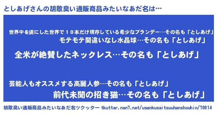 | 意味不明あだ名 | 『とにかく怪しいとしあげ』 |