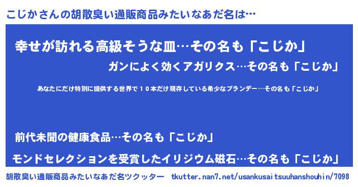 | 意味不明あだ名 | 『住所不定無職こじか(98歳)』『自称こじか』 |