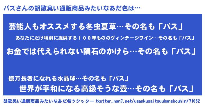 | ヒーロー風カッコイイあだ名 | 『慈愛の使者パス』『究極戦士パス』 |