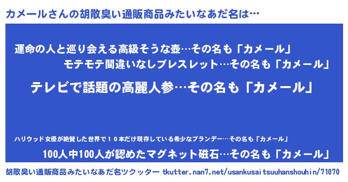 | 女子向けラノベタイトル風あだ名 | 『闇のカメール』『カメールの雑貨屋さん』 |