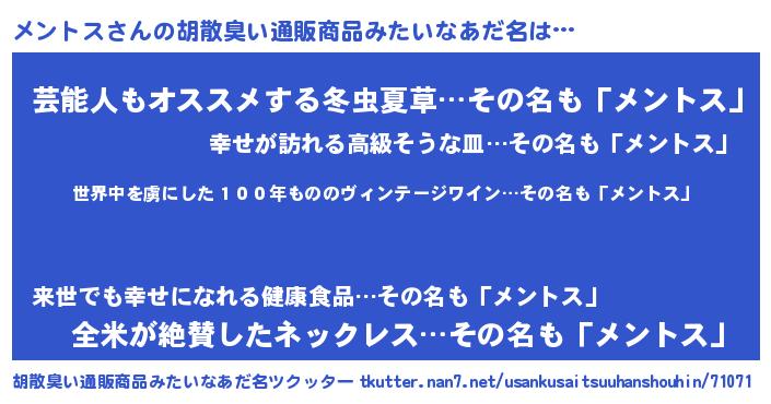 | 意味不明あだ名 | 『住所不定無職メントス(8歳)』 |