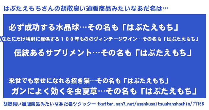 | 男性向けラノベタイトル風あだ名 | 『転生したらはぶたえもちだった件』 |