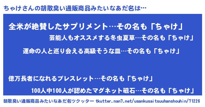 | 男性向けラノベタイトル風あだ名 | 『ちゃけに滅ぼされるだけの簡単なお仕事です』 |