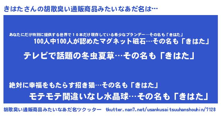| ヘコむあだ名 | 『きはっふぃ~』『きはた(遠い目)』 |