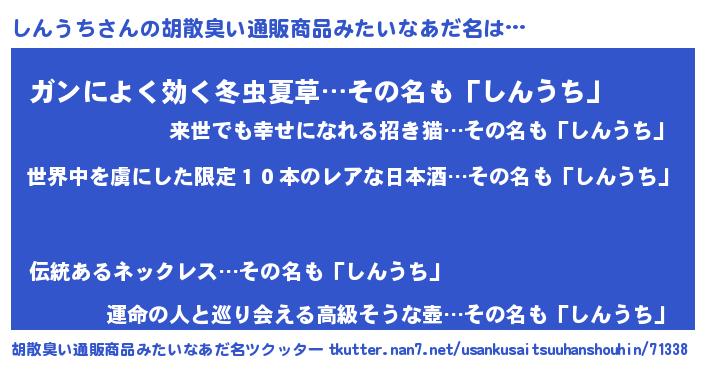 | 男性向けラノベタイトル風あだ名 | 『この素晴らしい世界にしんうちを!』 |