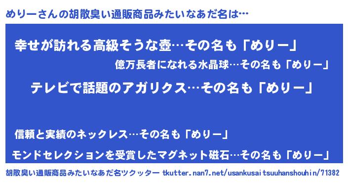 | ヘコむあだ名 | 『豆乳』『めりにー』『めりを』 |