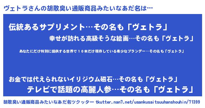 | 意味不明あだ名 | 『住所不定無職ヴェトラ(71歳)』 |