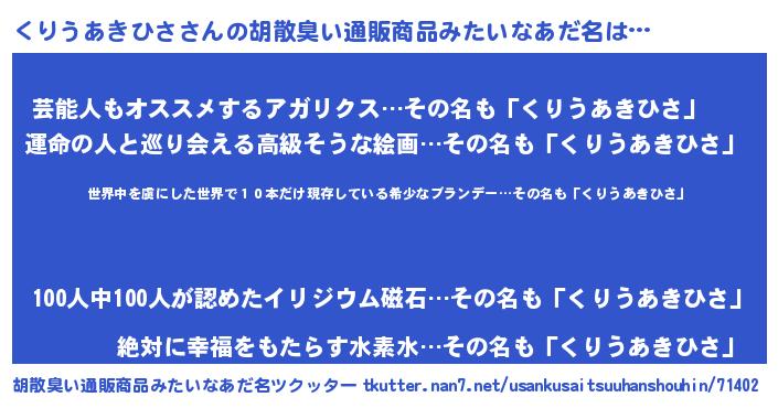 | 意味不明あだ名 | 『住所不定無職くりうあきひさ(91歳)』 |