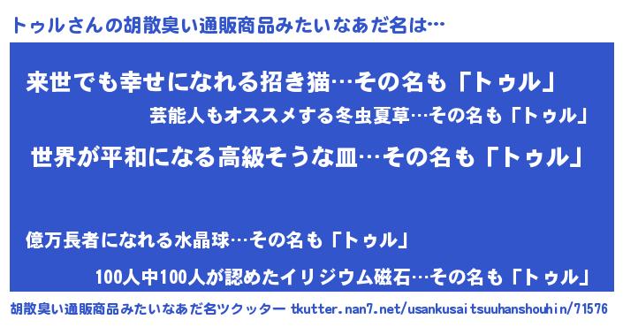 | 男性向けラノベタイトル風あだ名 | 『はたらくトゥルさま!』 |