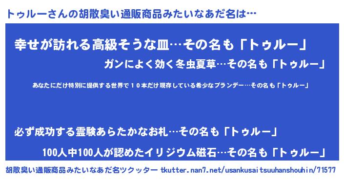 | 男性向けラノベタイトル風あだ名 | 『この素晴らしい世界にトゥルーを!』 |