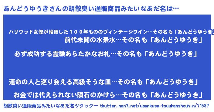 | ヘコむあだ名 | 『あんっふぃ~』『あんどうゆうき(笑)』 |