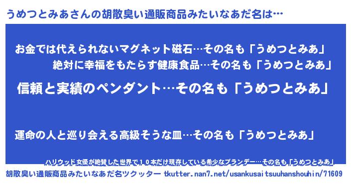 | 意味不明あだ名 | 『とにかく怪しいうめつとみあ』 |
