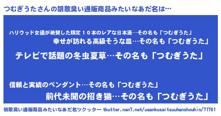 | 意味不明あだ名 | 『自称つむぎうた』『永久保存つむぎうた』 |