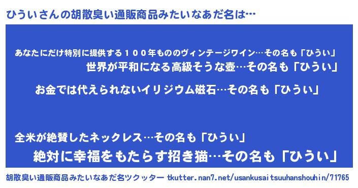 | ヒーロー風カッコイイあだ名 | 『慈愛の使者ひうい』『仮面ヒウダー』 |