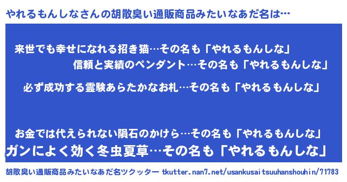 | 男性向けラノベタイトル風あだ名 | 『やれるもんしなの憂鬱』 |