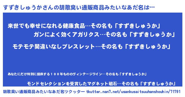 | ヘコむあだ名 | 『すずにー』『すずきしゅうか(爆)』 |