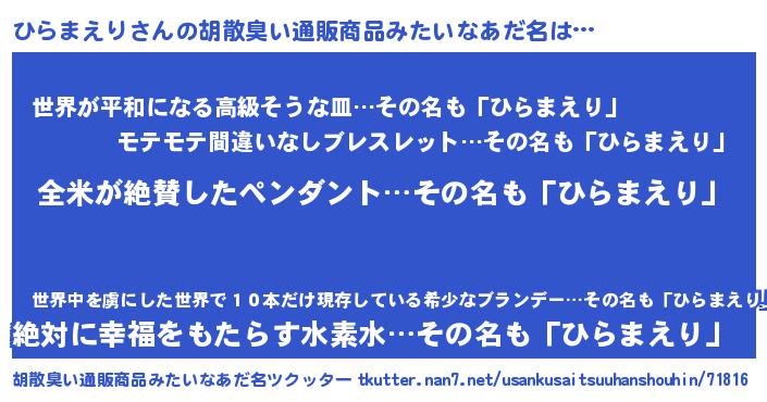 | 男性向けラノベタイトル風あだ名 | 『ひらまえりに滅ぼされるだけの簡単なお仕事です』 |