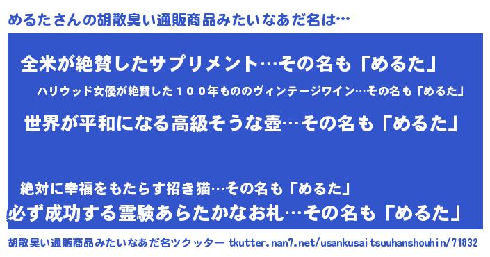 | 男性向けラノベタイトル風あだ名 | 『転生したらめるただった件』 |