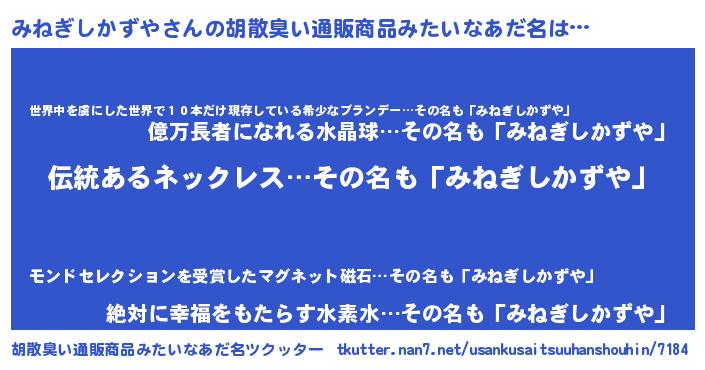 | 女子向けラノベタイトル風あだ名 | 『みねぎしかずやの卵を拾いまして』 |